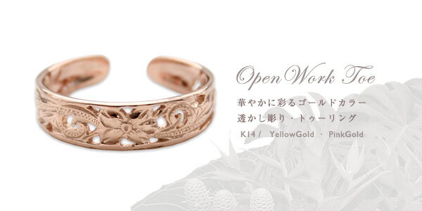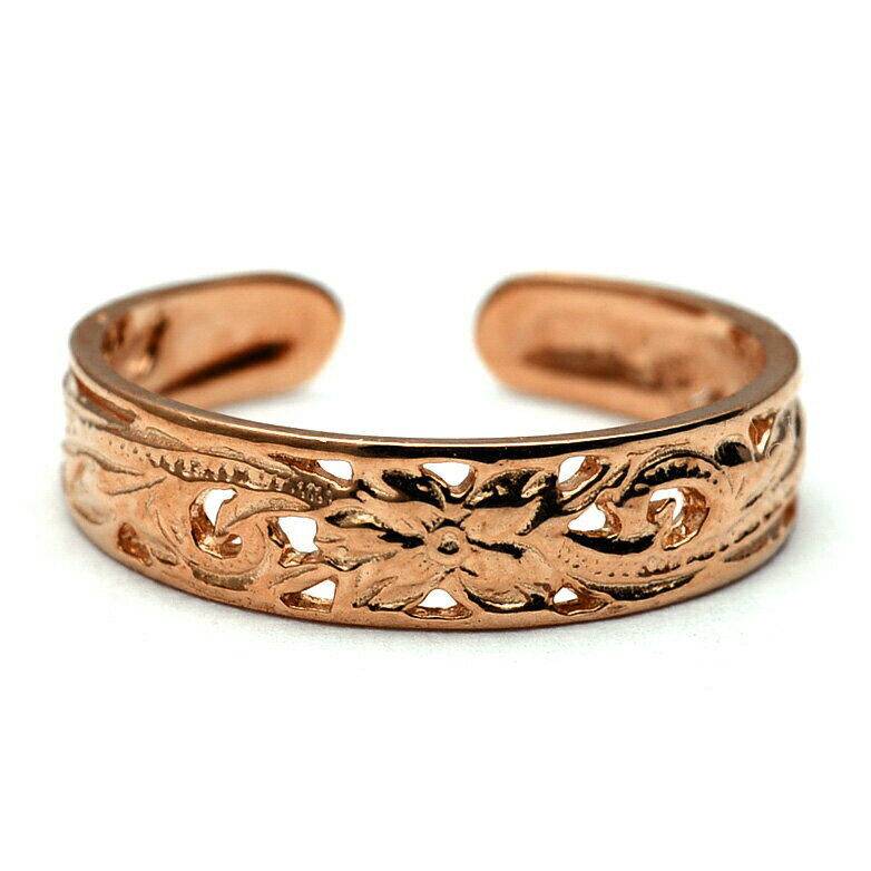 透かし彫りの技法を用いてK14ゴールドに流れを描くスクロールとプルメリアが美しい仕上り。